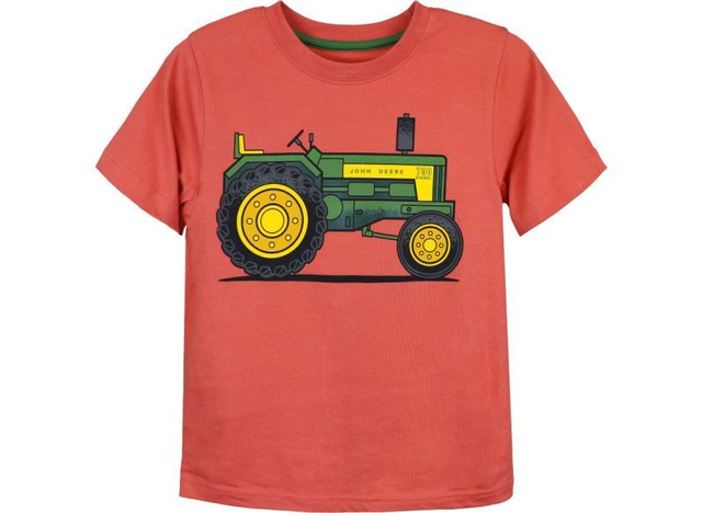 Orangefarbenes T-Shirt für Kinder mit Vintage-Traktor auf der Brust. Material: 100 % Baumwolle.